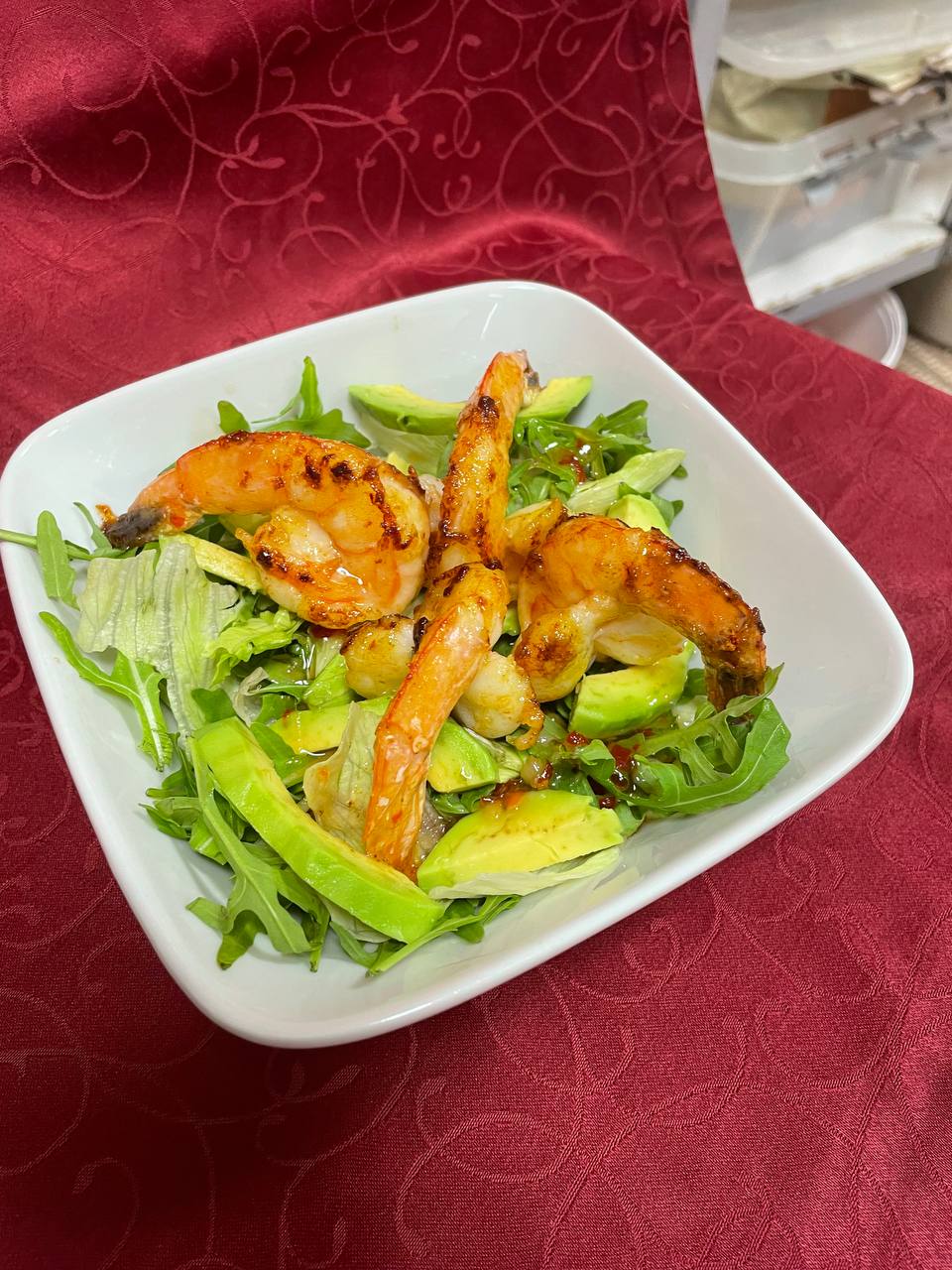 Салат с жареными креветками и соусом свит-чили